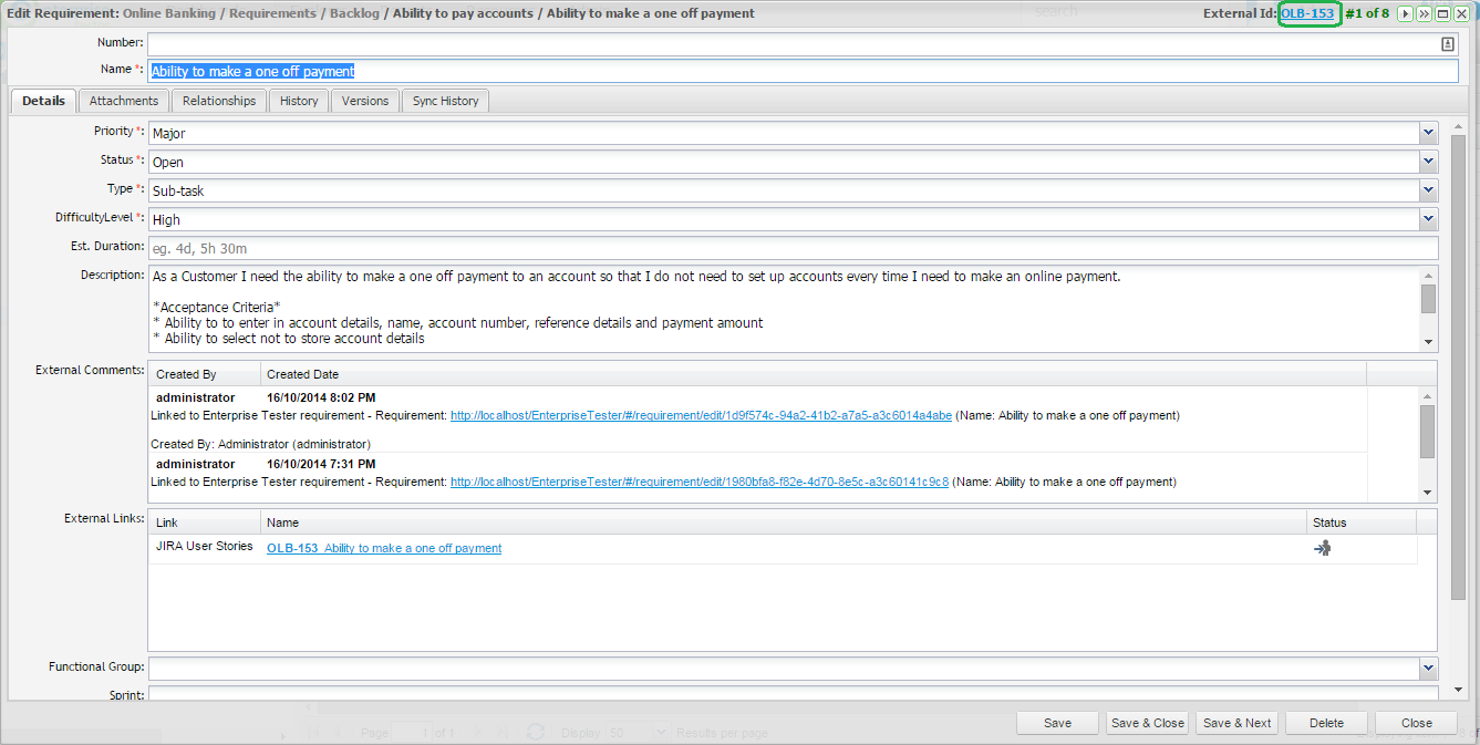 The ability to interface with multiple external systems (defect trackers, ALMs, EA etc.) is another key feature of the tool. This interface allows incidents and/or requirements (depending on the tool you are integrating with) to be synchronized between Enterprise Tester and the external system. When synchronizing with JIRA, TFS and Rally, for all supported entities, full bi-directional synchronization is supported regardless of the system the entity (requirement / user story / incident / defect) was originally created in. The direction and scope of the synchronization is configurable when working with these external systems. When synchronizing with EA, only entities originally created in EA and imported into ET will be included in the synchronization. Only requirement updates are supported when synchronizing from ET to EA. For more information, please see the help article related to your external system in the list of help topics for configuring project links below.