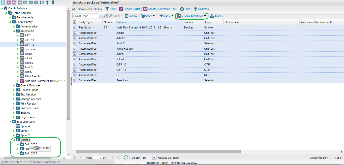 Once the Automated Test Script is created, you can then add it to your execution set similarly to the way manual tests are added to the execution set in Enterprise Tester, by drag and drop from the script library to the execution set package by using the Create button on the Script Summary grid tool bar.