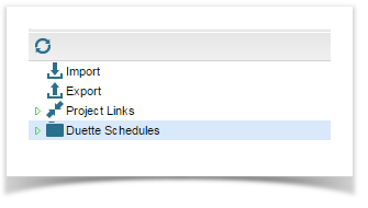 You can configure Duette Schedules from the Resources tab of the tree view navigator. When the Duette Plugin is enabled, a section called "Duette Schedules" is available.