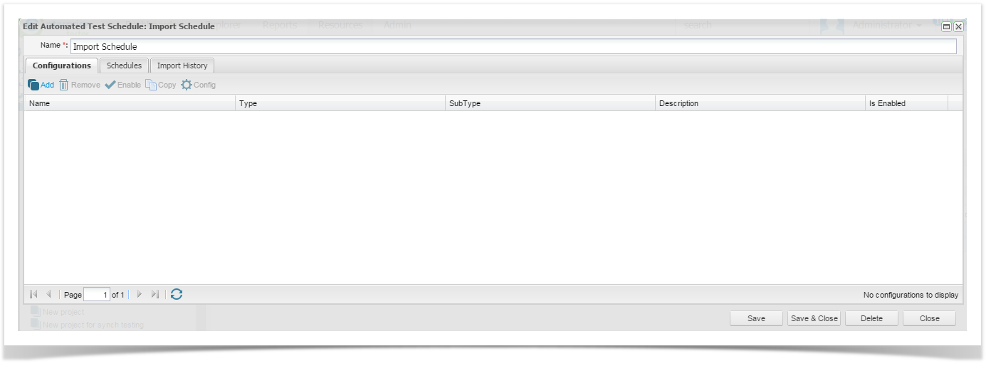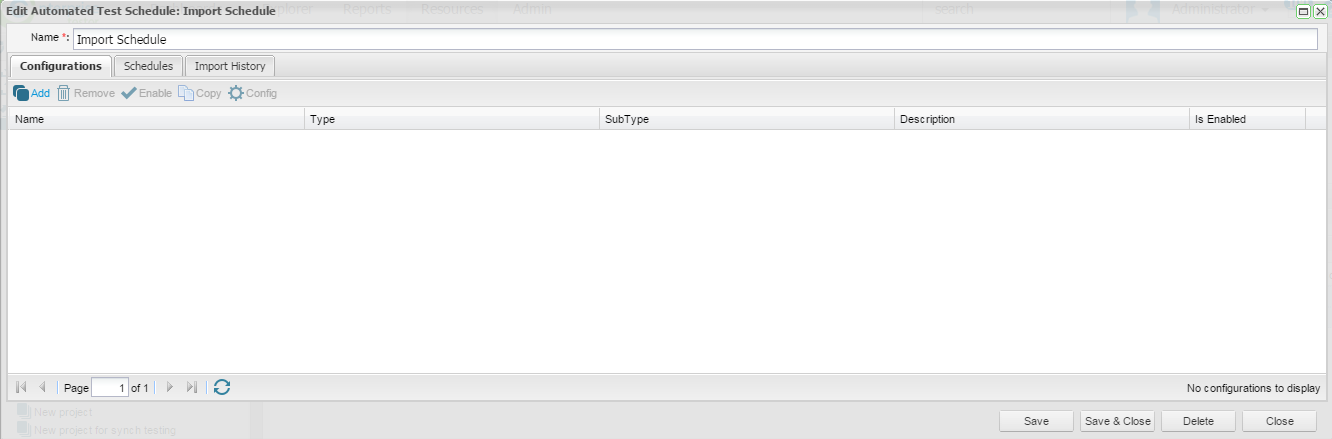 To create a new schedule, expand Duette Schedules to list all projects. Right click on the project you wish to create the schedule for. Select Add Schedule from the menu. The Edit Automated Test Schedule screen will display where you can add one or more configurations and set schedules for imports ( adhoc, periodic or daily intervals).