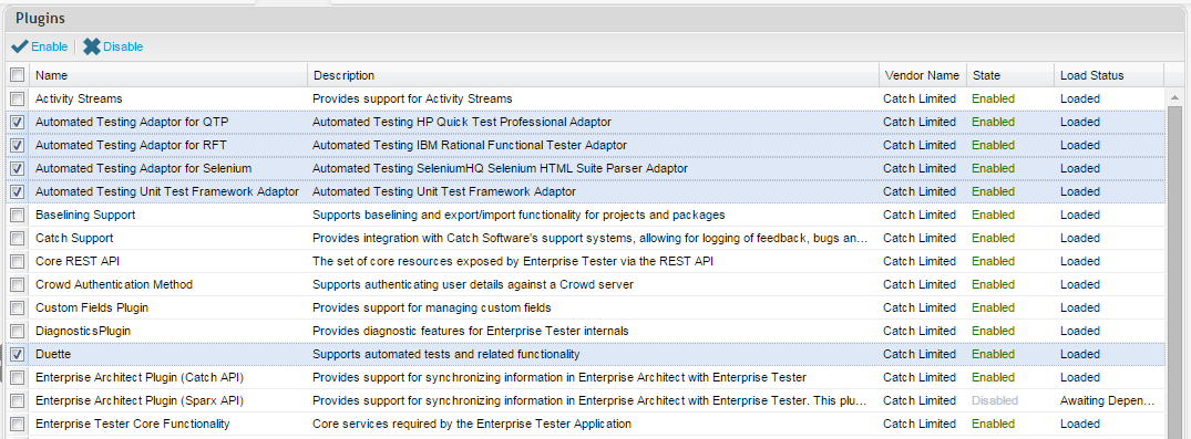 - The Plugin screen will display. Ensure that the Duette Plugin and at least one of the testing adaptors (QTP, RFT, Selenium or Unit Testing Frameworks) is enabled depending on the tool you want to import from. By default, the Duette plugin should be enabled.