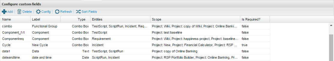 Custom Fields provide flexibility to capture additional data within the application. Specifically, custom fields can be added to requirements, test cases, test cases in your execution sets and incidents. This feature allows you to add additional fields according to your needs in order to record additional information against these entities. A wide selection of field types can be created including: