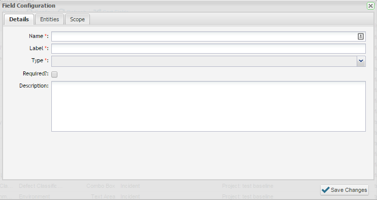 7. Click on the Entities tab to select the types of entities (Incident, Requirement, Test Scripts) which will include the custom field. Note that you can use the same custom field across multiple entities.