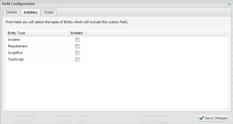 12. Click on the Entities tab to select the types of entities (Incident, Requirement, Script Run and Test Script) which will include the custom field. Note that you can use the same custom field across multiple entities.