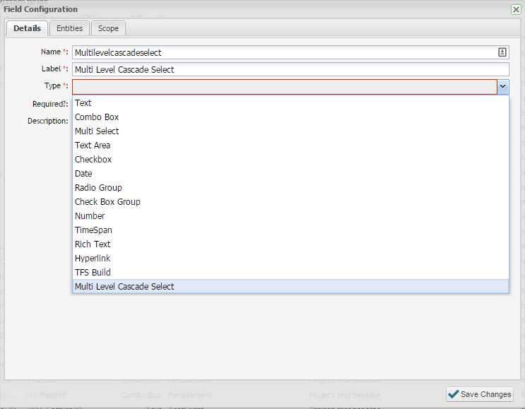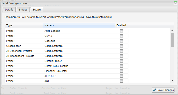 9. By adding scope for an organization, all projects for that organization will use the custom field for the entity selected.  You can add specific custom fields for specific projects by including them here. When you specify the scope, entities will be updated to include the new field i.e. requirements, scripts and incidents that have previously been created will be updated to include the new custom field.  If the field is mandatory, the user will be prompted to add this additional detail before saving.