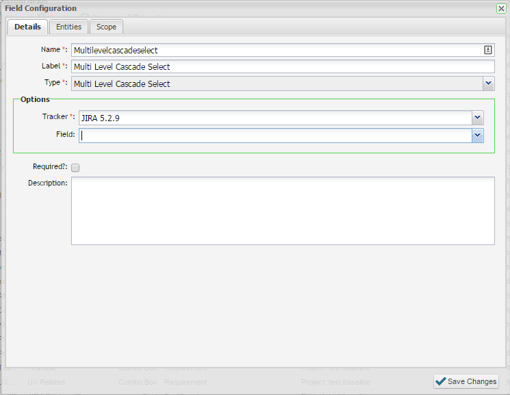Creating a multi-cascade select custom field is similar to creating any other custom field with in Enterprise Tester.  The values used to populate the picklist values for the multi-cascade select field are pulled from the defect tracker e.g. JIRA. A defect tracker must be configured to create this custom field successfully.
