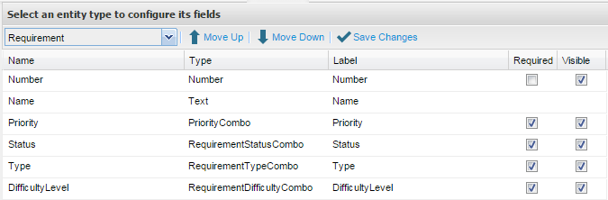 Custom Fields can be sorted by entity. This allows you to specify the order that the fields will appear on your requirement, test script or incident. From the Configure Custom Fields screen: