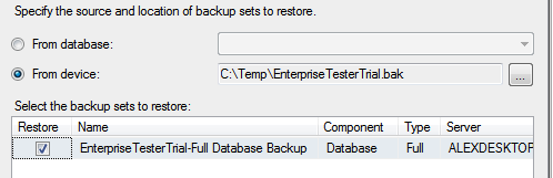 From here you must select the location of the backup you wish to restore, locate the file from the previous step i.e. c:\temp\EnterpriseTesterTrial.bak.