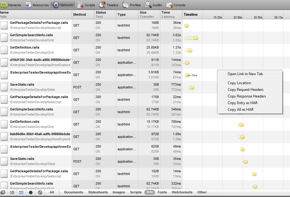 - When saving the request info, just right-click and select "Save All as HAR", which will prompt you for a location to save the file (so you don't need to copy/paste text into a text editor, as you do for Safari).