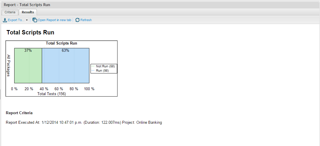You can define the package to report on and the test type(s) you would like to view the Run status of. You can select Automated Test Assignments or Manual Test Assignments (Test Script Assignments).
