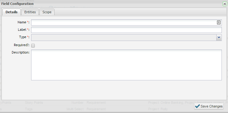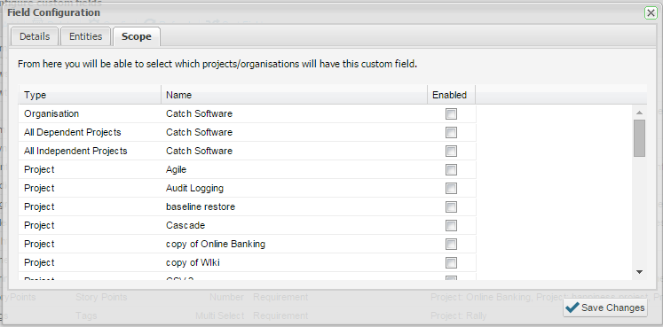 - By adding scope for an organization, all projects for that organization will use the custom field for the entity selected. You can add specific custom fields for specific projects by including them here. When you specify the scope, entities will be updated to include the new field i.e. requirements, scripts and incidents that have previously been created will be updated to include the new custom field. If the field is mandatory, the user will be prompted to add this additional detail before saving.