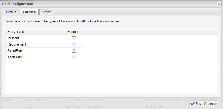 - Click on the ‘Entities’ tab to select the types of entities (Incident, Requirement, Test Scripts) which will include the custom field. Note that you can use the same custom field across multiple entities.