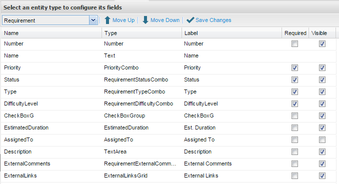 Custom Fields can be sorted by entity. This allows you to specify the order that the fields will appear on your requirement, test script or incident. From the Configure Custom Fields screen:
