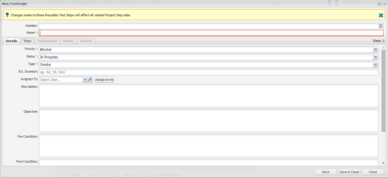 The standard Test Script screen will be displayed, you will notice buttons the toolbar Insert Reusable Master Steps and View / Edit Reusable Master Steps