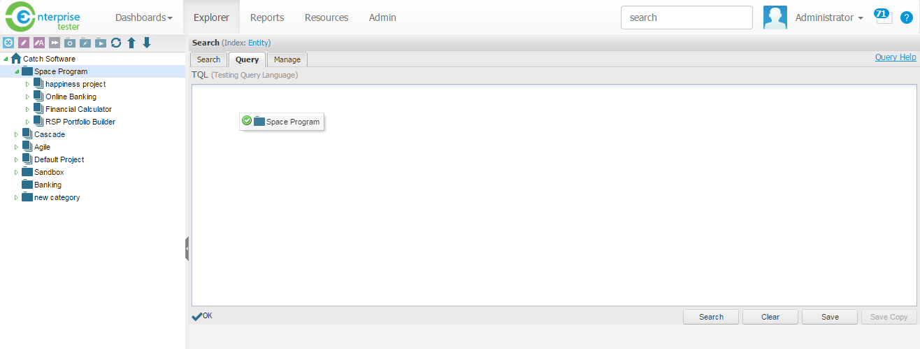 Open the Query tab on the search screen. Start by adding the project category to your query. To do this, from the navigator, drag and drop your project category on to the query screen.