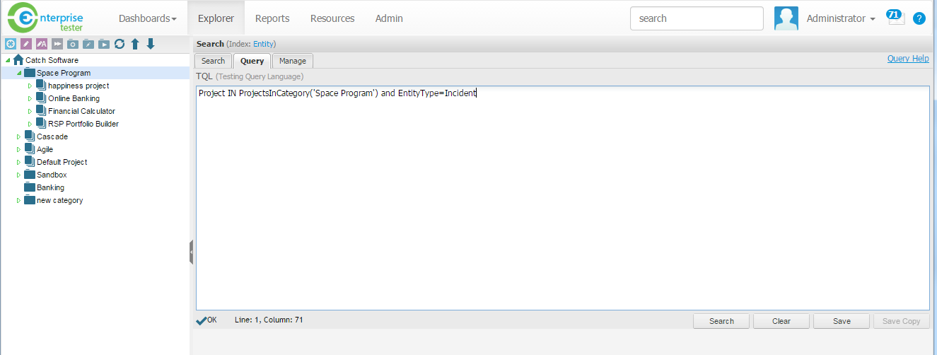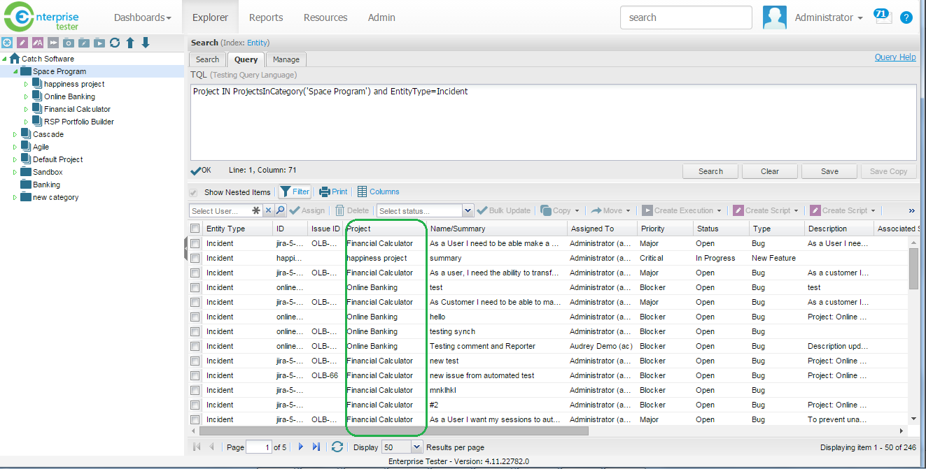 In this example, the query has returned all incidents for all projects in the Space Program project category.