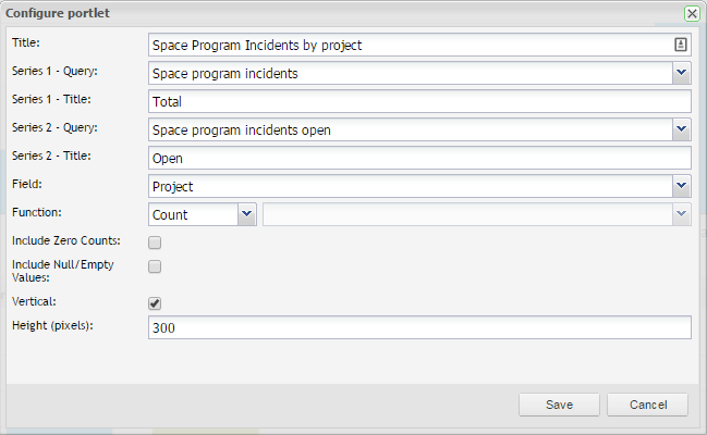 For example, to create a report chart on My Dashboard to show all the total incidents raised and the total open by project for all projects in the Space Program Category (as in the example screen shot above).