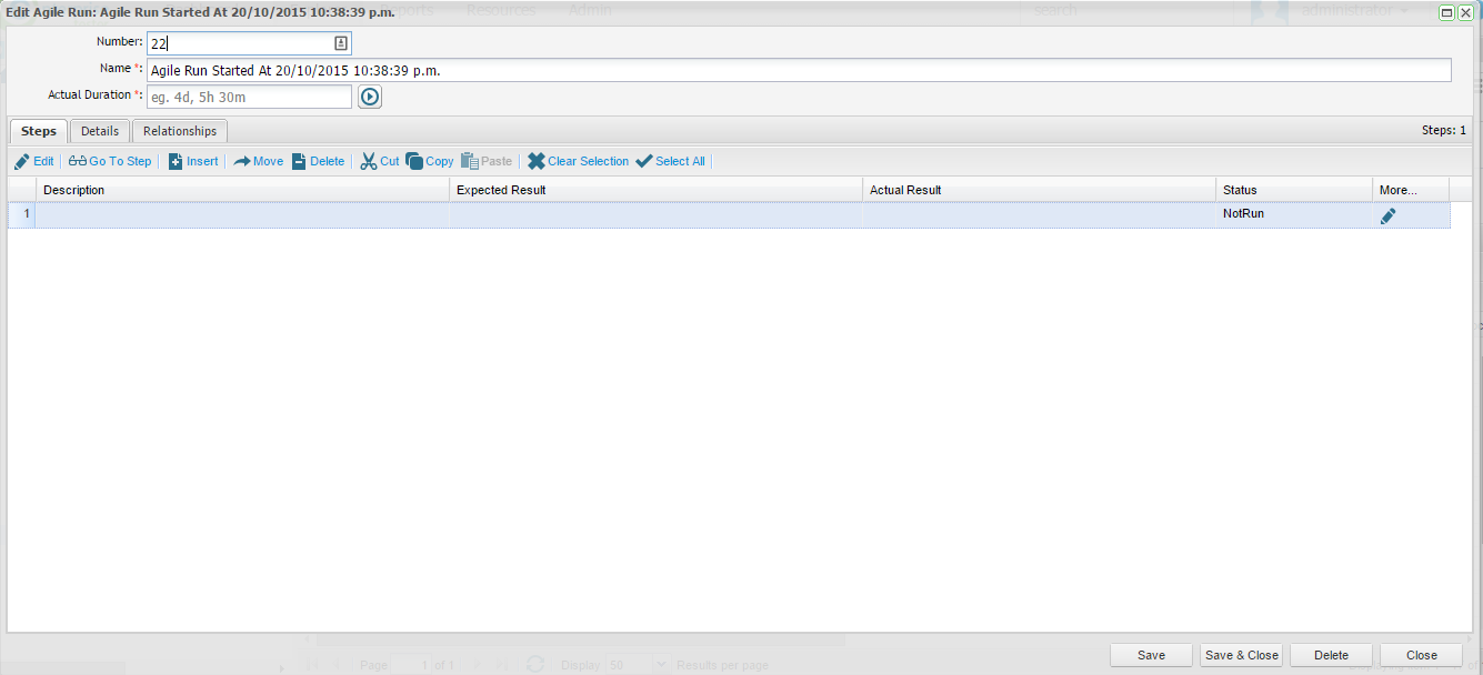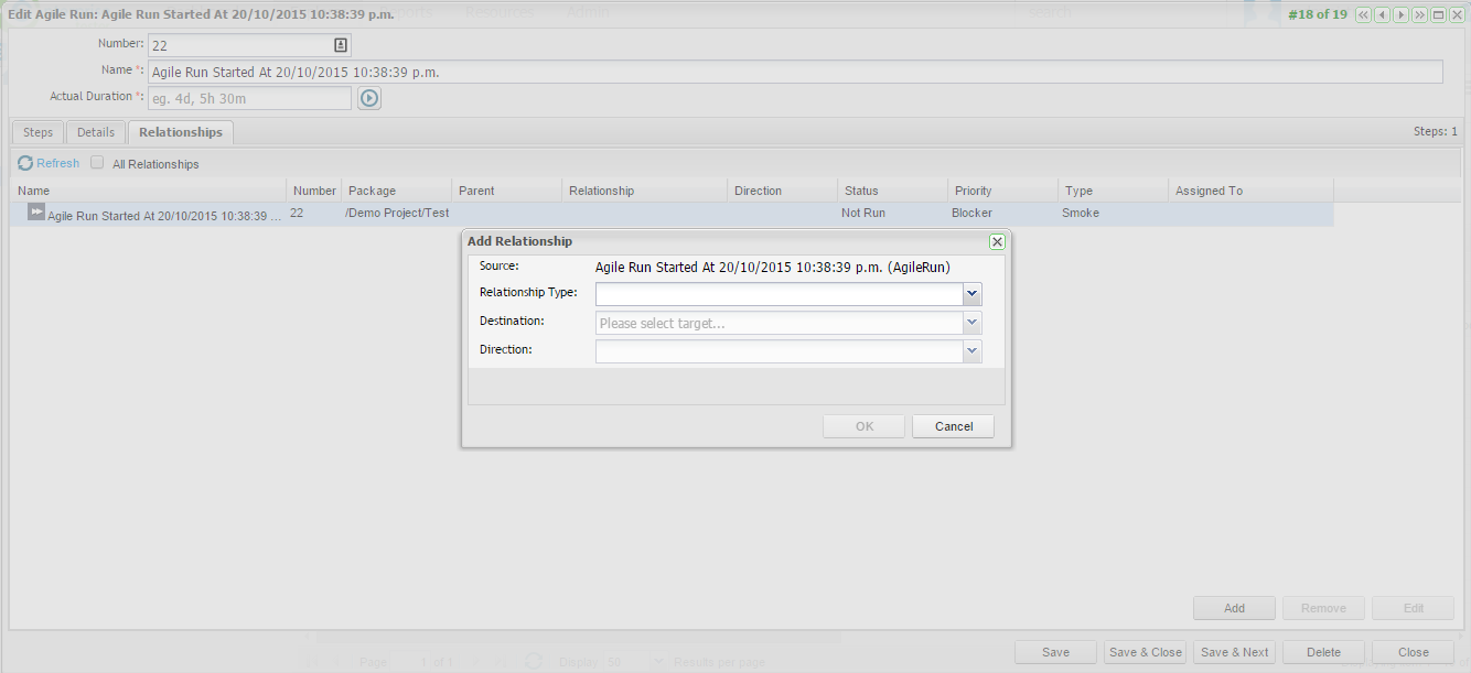If an Incident is raised during the Agile Run or if the Agile Run is later converted to a Test Script, relationships will automatically be added.