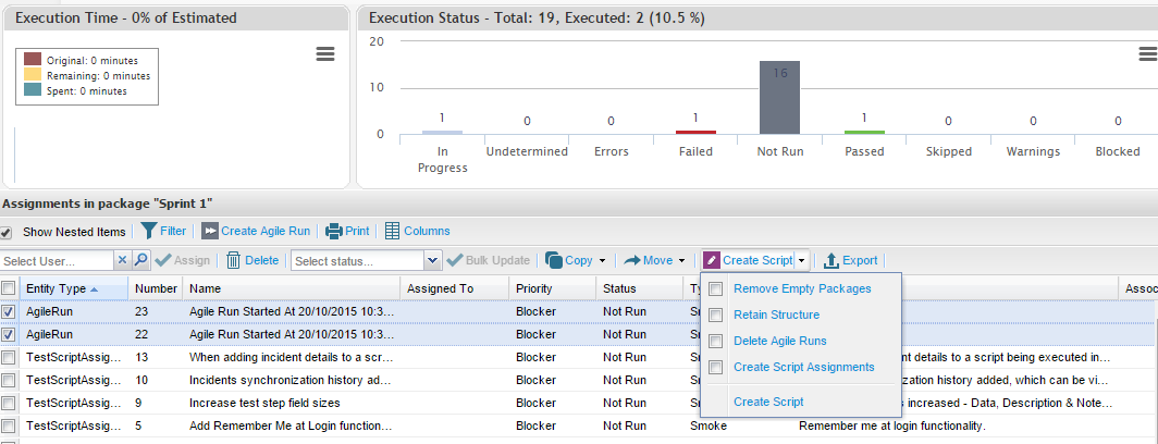 • Create Script Assignment - in addition to creating the Test Script, convert the Agile Run to an executed test in the execution set.