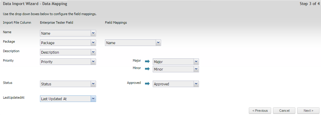 The application will read the CSV file and ask you to map the fields in Enterprise Tester to those in your CSV.  Use the drop down boxes to map the fields in your CSV file to the fields in Enterprise Tester.