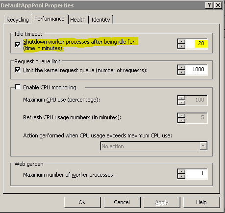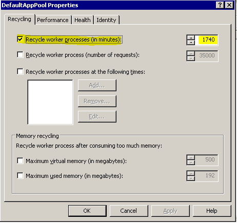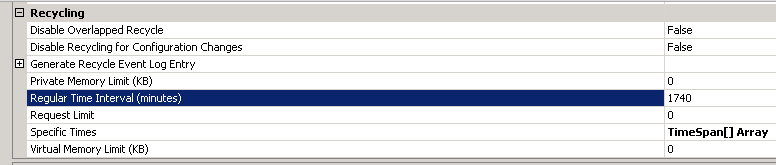 In addition there is also another setting, which controls the maximum number of minutes the application pool can be active before it is recycled - this setting is the "Regular Time Interval (minutes)" Recycle trigger. This feature is intended to recycle the process on a regular basis (normally every 1-2 days) to avoid the effects of memory leaks etc. that may exist in software.