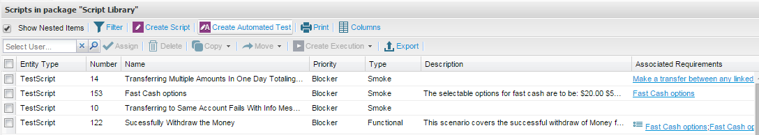 - Similarly to manual test scripts, you can view all relationships associated to the script from the Relationships tab which displays all associated requirements and execution sets.