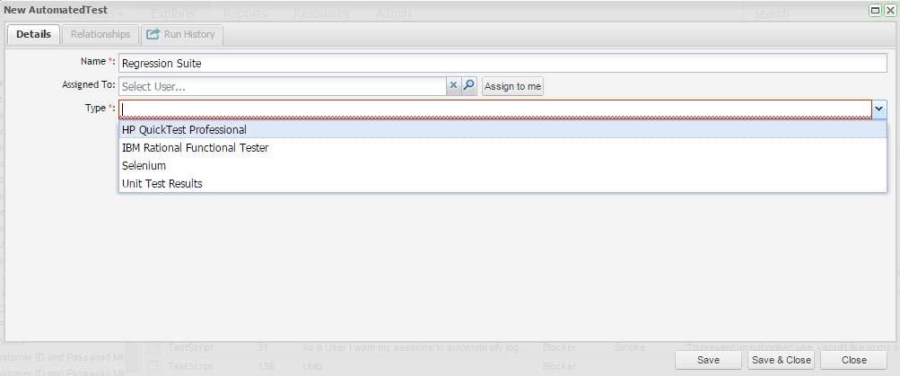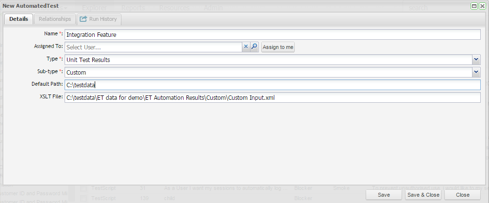 - The Edit Automated Test Screen will open. Here you can add the Name of the script, assign it to a user and select the type of automated test. Once these fields are completed, the Default Path field will open. In this field the path to the automated test tool results in your file system can be specified.