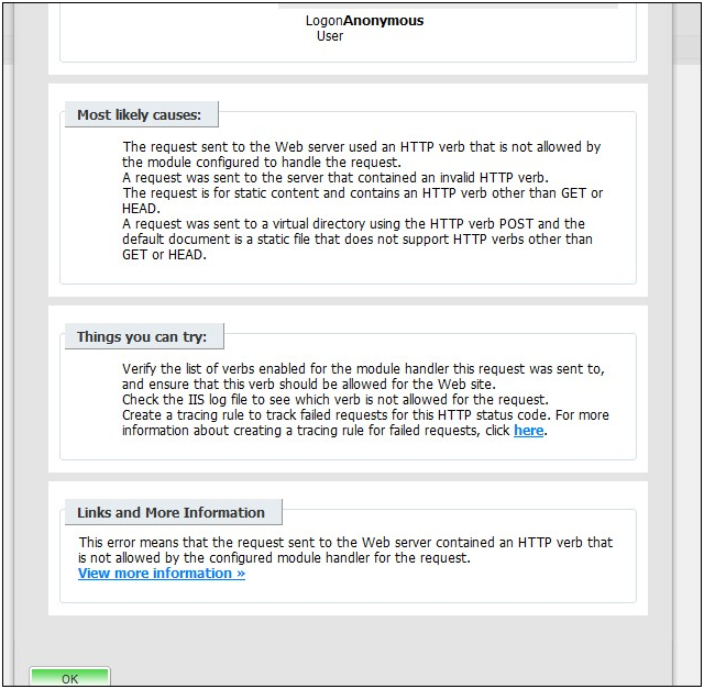 Resolving IIS 7 and 7.5 HTTP 405 - HTTP verb used to access this page is not allowed errors