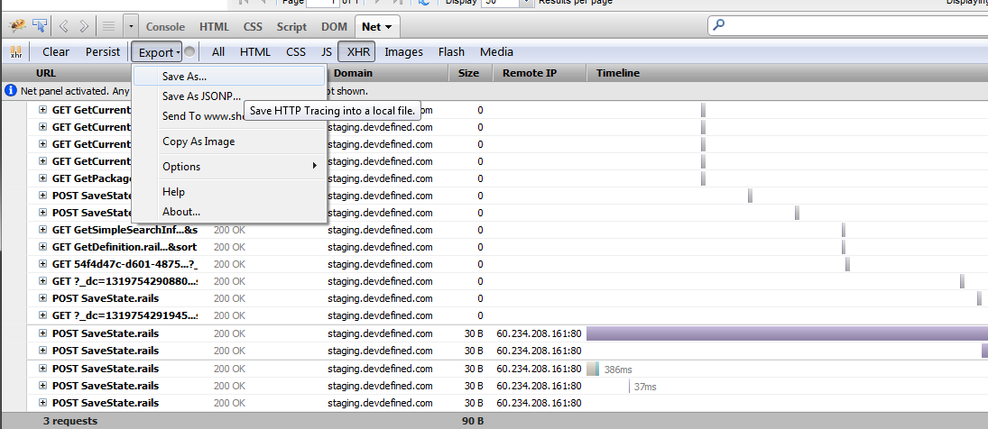 - When saving the request info, just right-click and select "Save All as HAR", which will prompt you for a location to save the file (so you don't need to copy/paste text into a text editor, as you do for Safari).