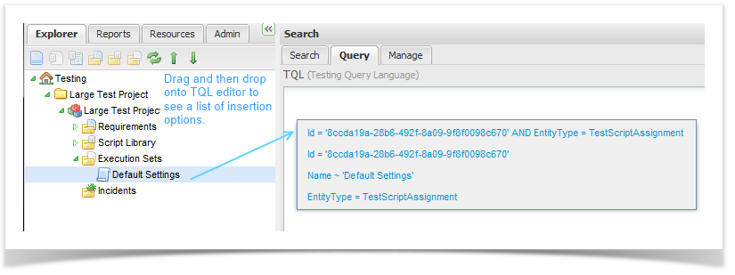 Identifiers for entities can be extract from the url of edit screens, or by dragging the entity from the tree directly into the TQL query screen. You will be provided with a set of suggested query fragments that can be inserted and will include the ID:
