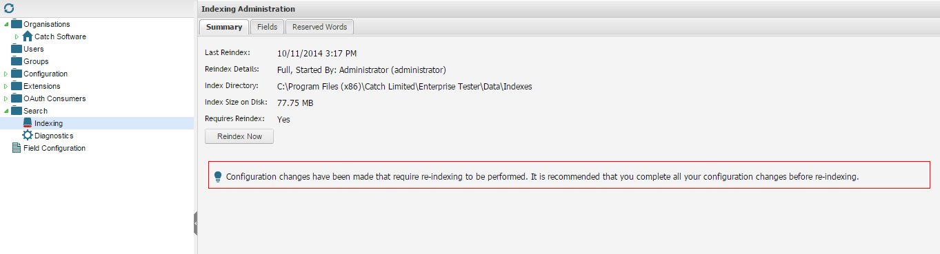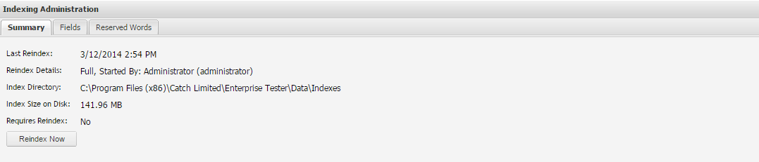 If a re-index is required and an Administrator logs into Enterprise Tester – they will be redirected to the Indexing Administration page.