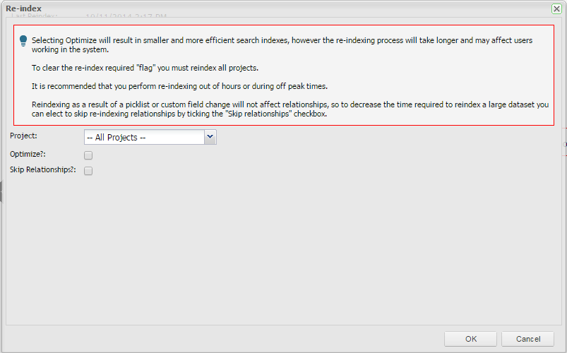 4. Check Optimize? if required.  This will result in smaller and more efficient search indexes, however the re-indexing process will take longer and may affect users working in the system.