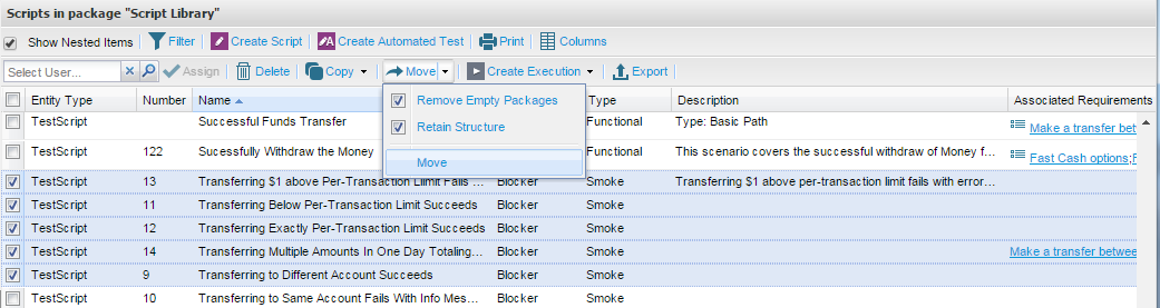 From the Script Library grid you can select one ore more scripts to move into another package with in the same project or within another project. Select the scripts you wish to move by checking the scripts. Then select Move from the toolbar.