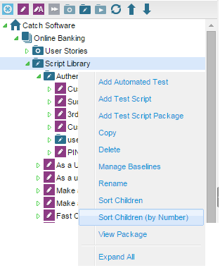 You can sort test script to be ordered either alphabetically or by script number. Right click on the Script Library. To sort script alphabetically, click on Sort Children. To sort scripts by script number, click on ‘Sort Children (by Number).