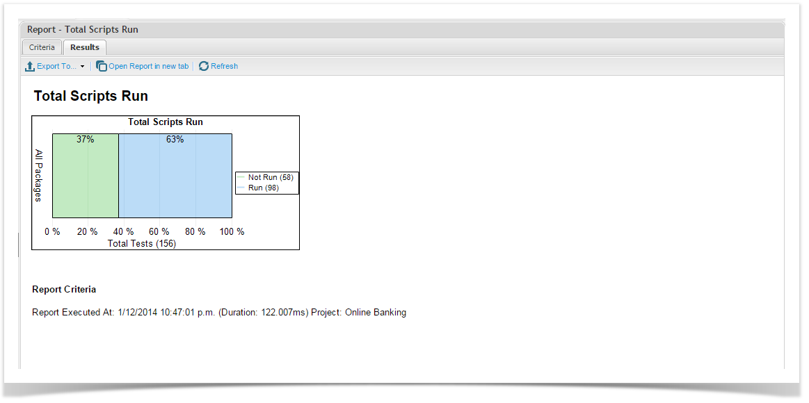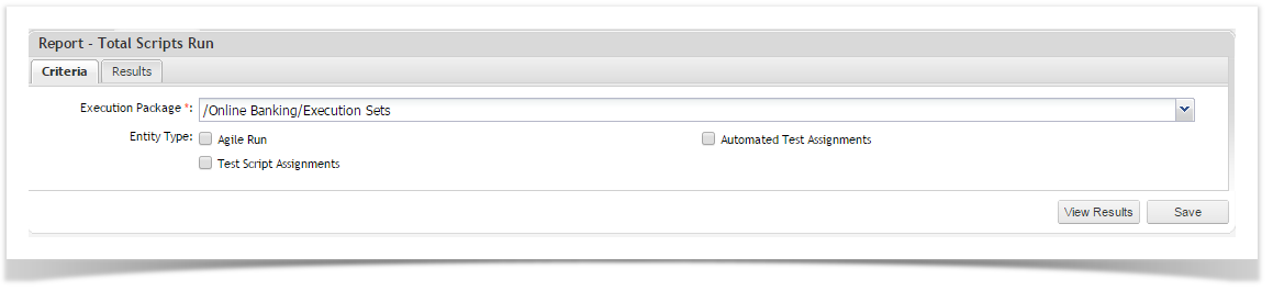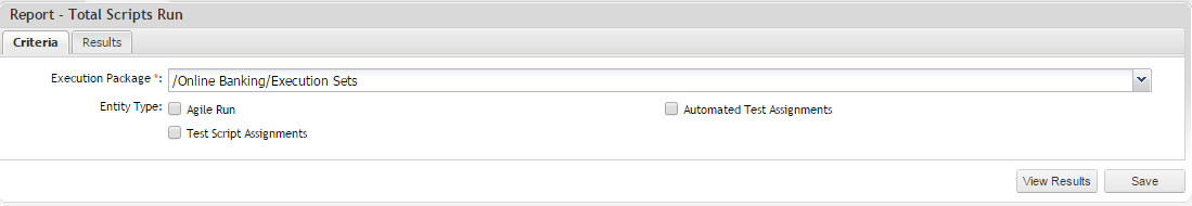 You can define the package to report on and the test type(s) you would like to view the Run status of. You can select Automated Test Assignments or Manual Test Assignments (Test Script Assignments).
