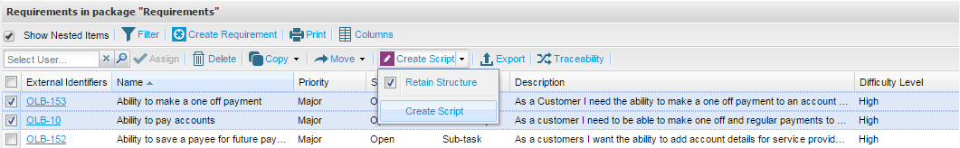 Test scripts can be created from requirements. You can bulk create test scripts from the requirement grid.