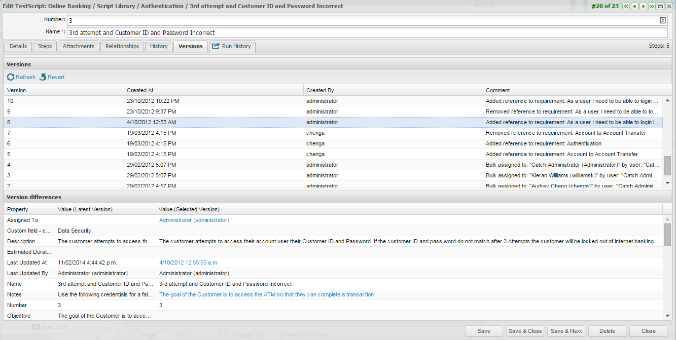 As you modify an element a further incremental version is automatically created. When viewing your requirement or test script, by clicking on the Versions tab you will be able to view all versions and compare the elements of a selected version to the current version.