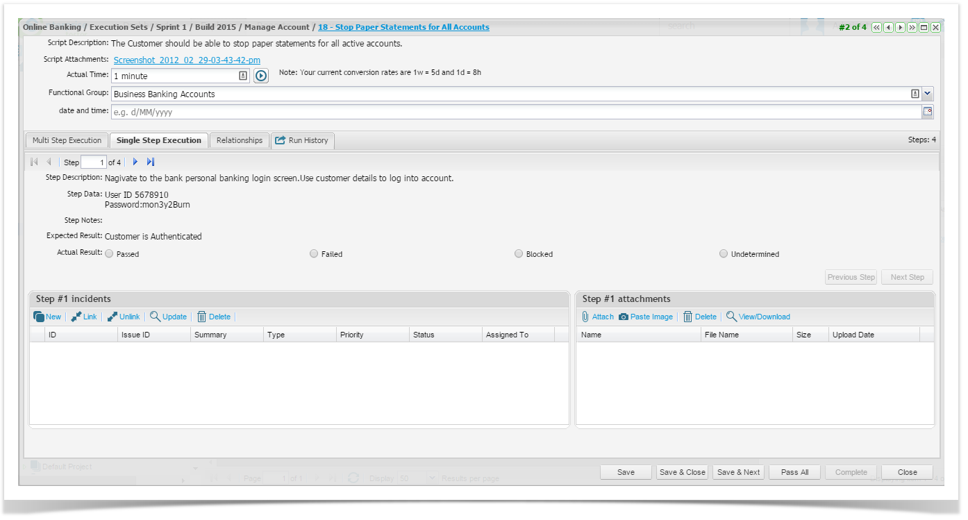 6. Type in the results, notes and select the status for the test step etc.