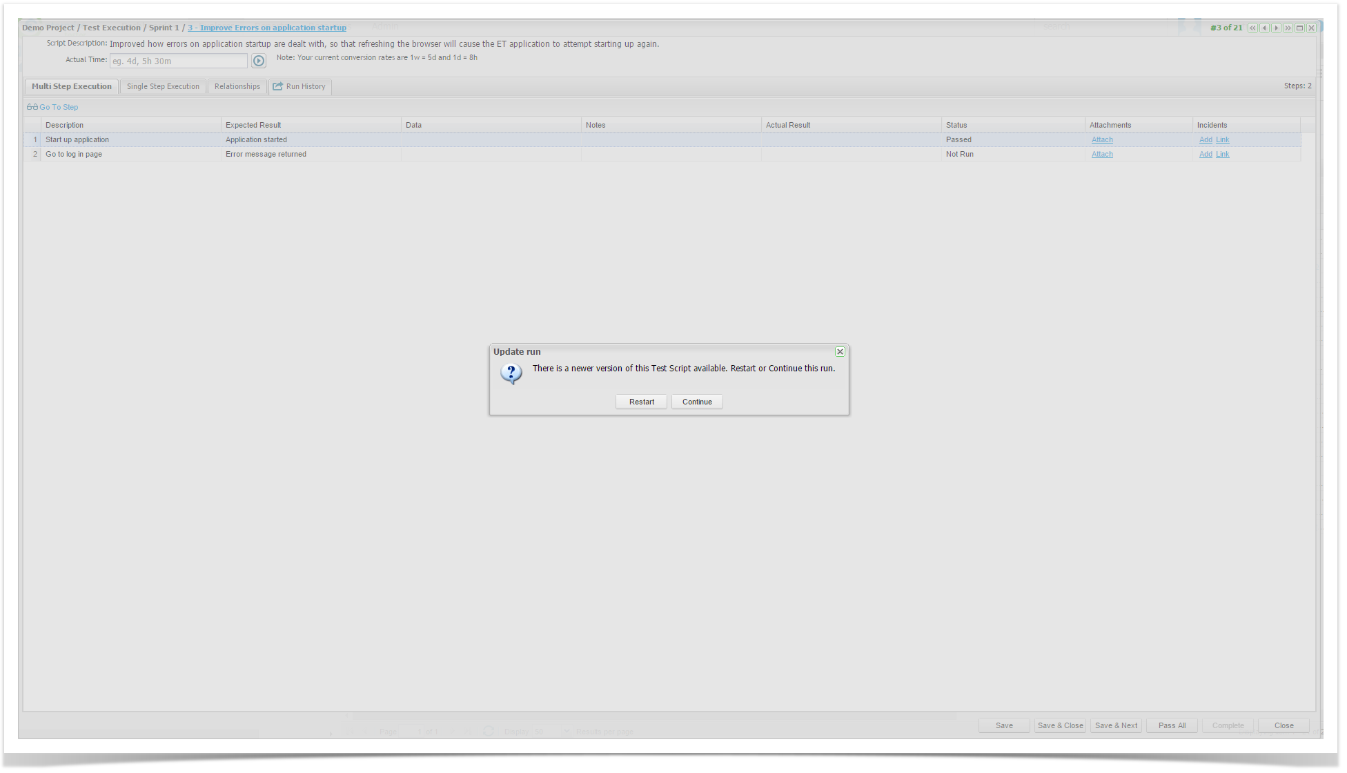 If a Test Execution window in mid-run is closed and re-opened, and if the related Test Script has changed in the interim you will be prompted to either continue or restart the run.