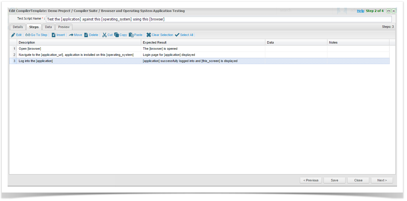 Compiler Suite Steps tab is consistent with the Test Script Steps screen.  This is where you build your Test Script using variables.