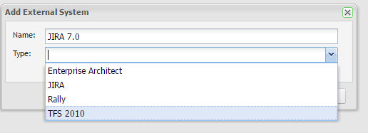 • Click Add from the toolbar and add a name for your external system connection, select a Connection Type