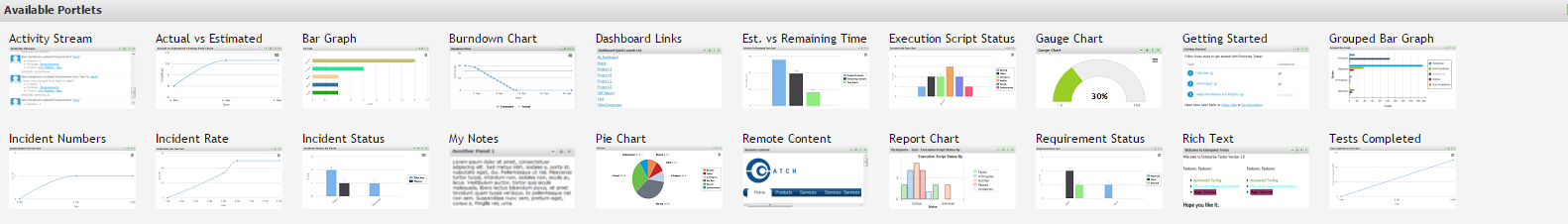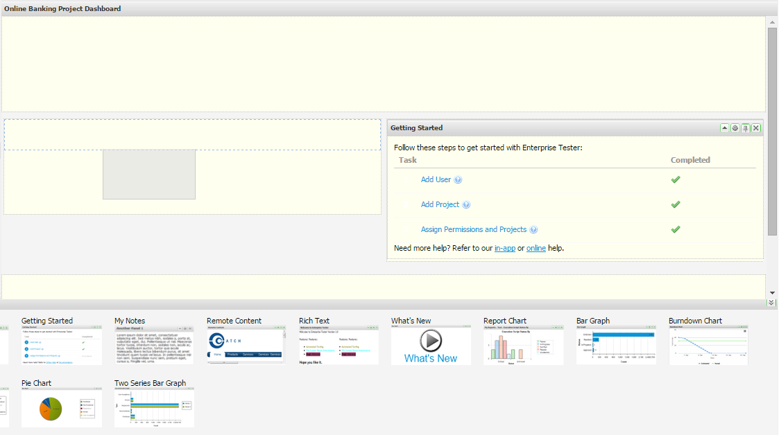 Dashboards can be established to display summary information at any level within Enterprise Tester.