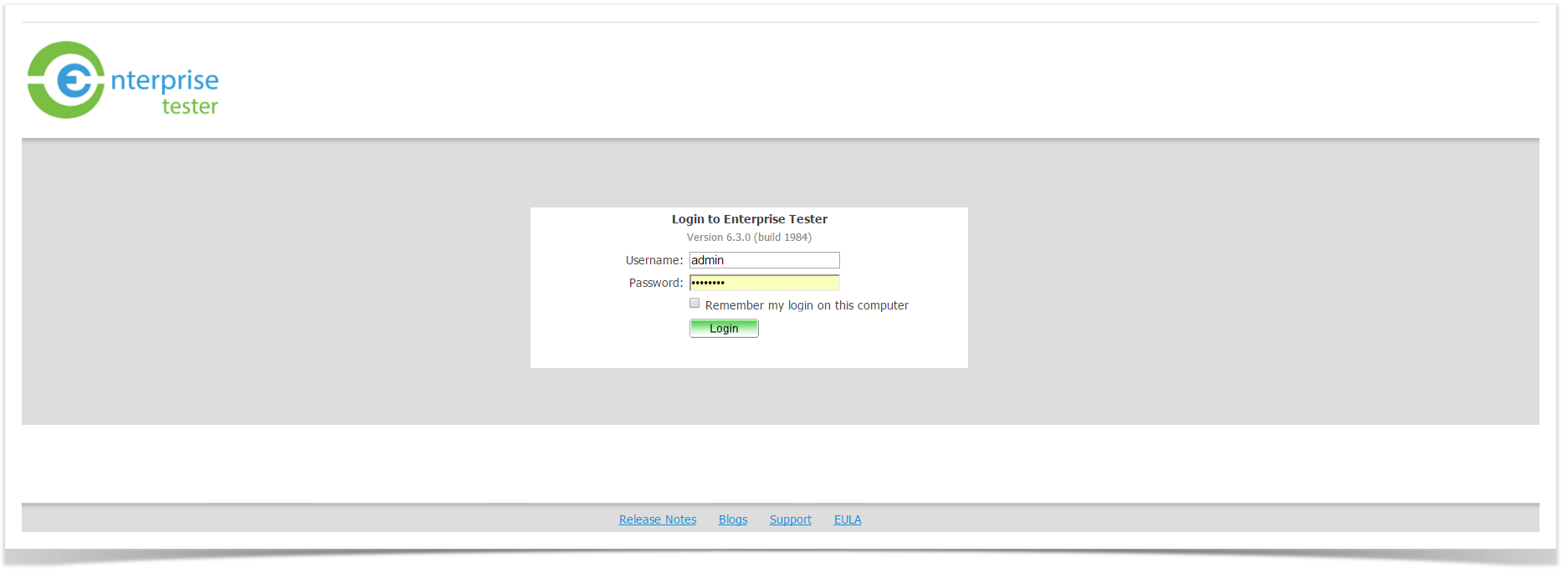 After navigating to the your Enterprise Tester instance in your browser, the login screen will appear.