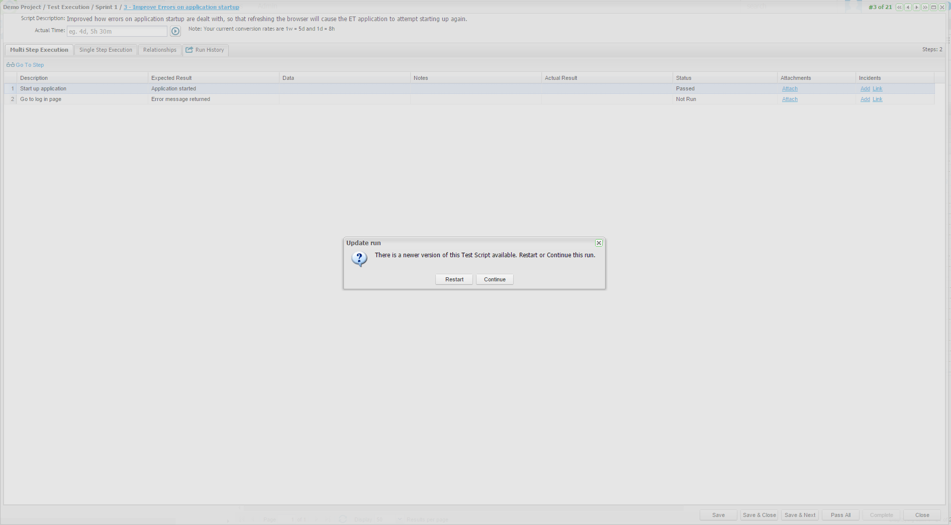 If a Test Execution window in mid-run is closed and re-opened, and if the related Test Script has changed in the interim you will be prompted to either continue or restart the run.