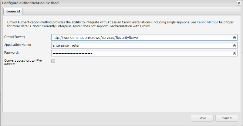 | Convert Localhost to IPV6 | When enabled, the Crowd authentication method will automatically transform IPV4 loopback addresses and localhost host names to the equivalent IPV6 loopback address, when generating remote_address validation factor to be supplied to Crowd. It's only necessary to enable this if you find validation is failing. Often this occurs when Enterprise Tester and Crowd are both running on the same server. |