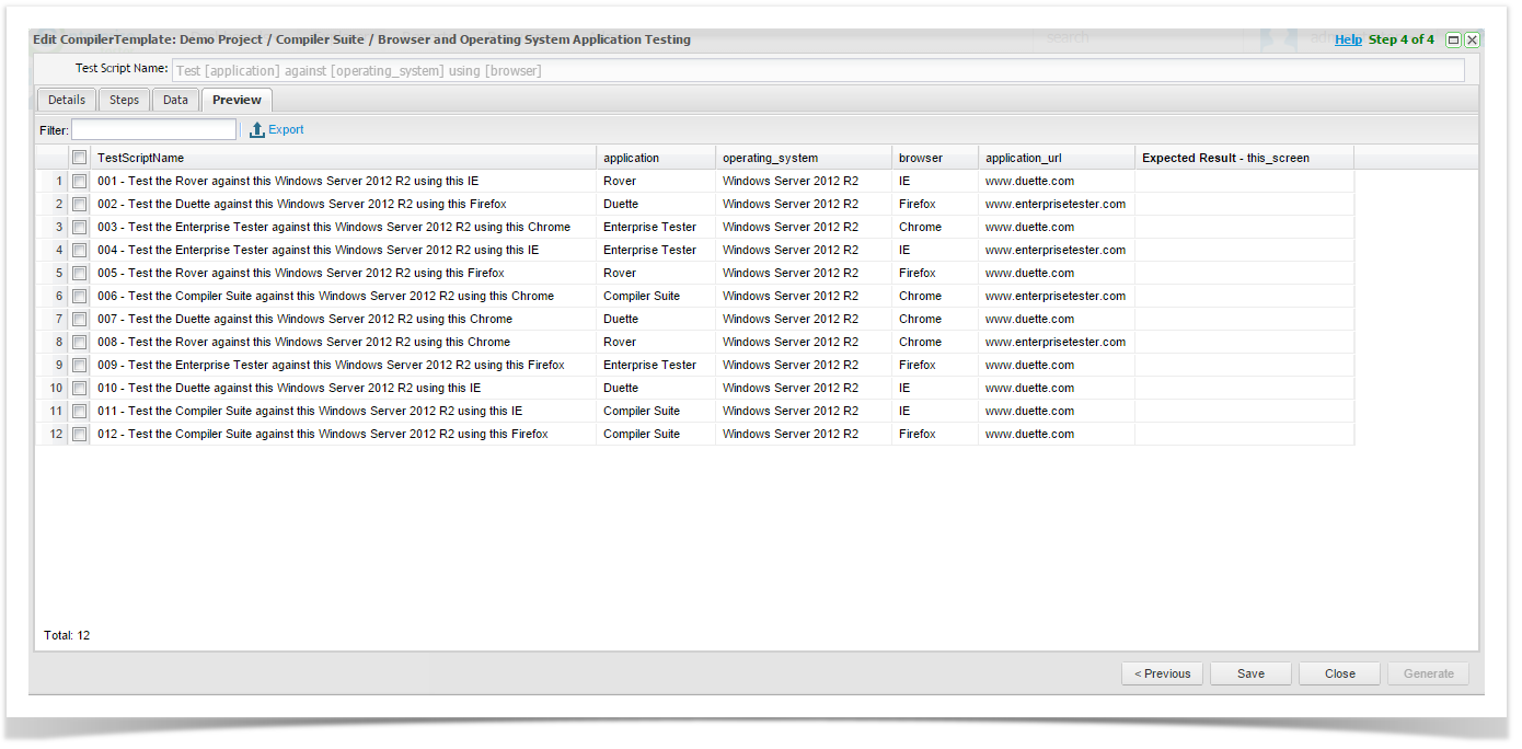 - The Test Script Names are displayed. As the Test Script Names had variables in the Steps screen, you can see the Test Script Names are all different depending on the variables. This makes the Test Script Names more descriptive.