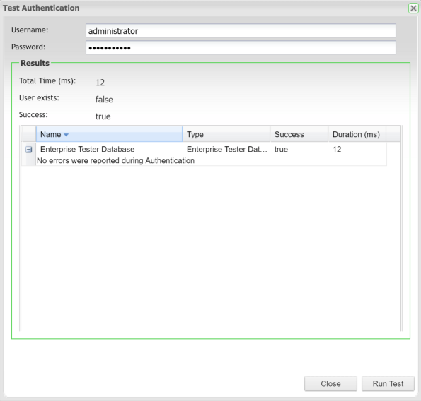 Enter a username and password, then click "Run Test" button which will then attempt to authenticate the user against all enabled authentication methods.