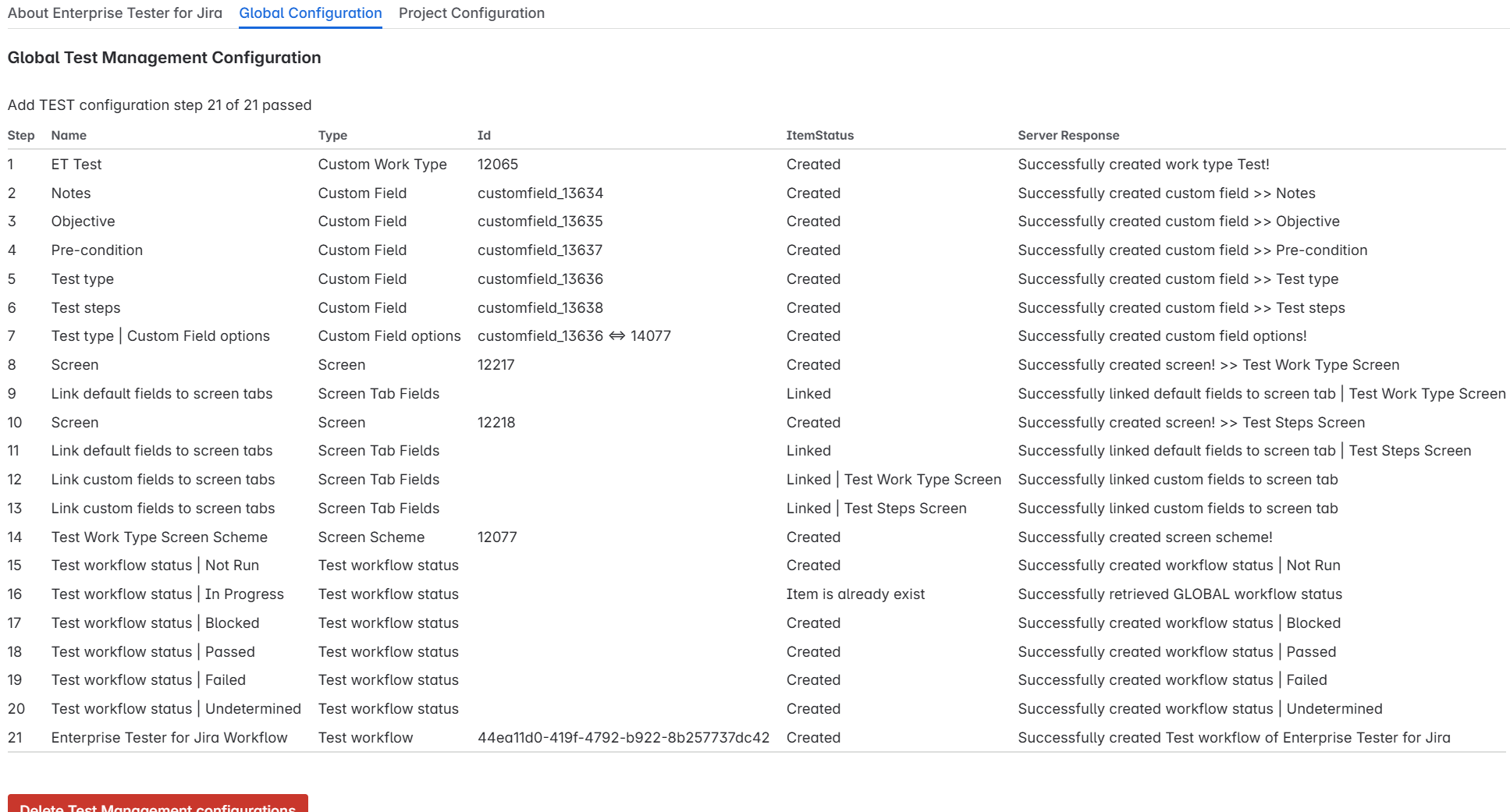If a configuration exists for the project, a Delete Test Configuration of Project button will be visible.